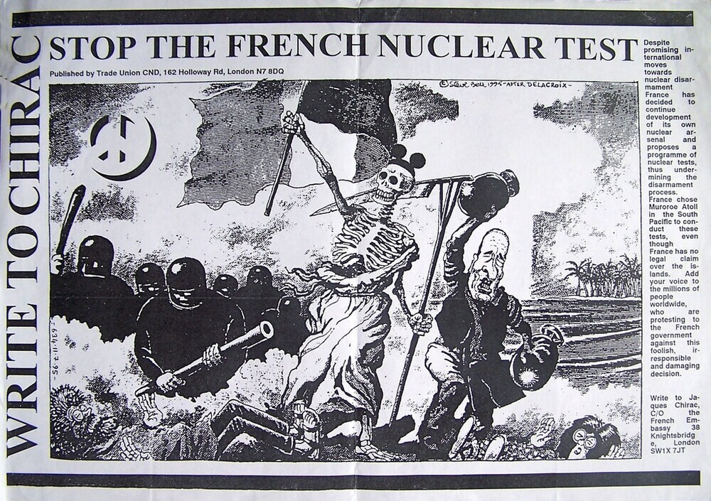 Scope and ContentPoster with a cartoon by Steve Bell and the text: Stop the French nuclear test. Write to Chirac. Despite promising international moves towards nuclear disarmament France has decided to continue development of its own nuclear arsenal and proposes a programme of nuclear tests, thus undermining the disarmament process. France chose Muroroe Atoll in the South Pacific to conduct these tests, even though France has no legal claim over the islands. Add your voice to the millions of people worldwide, who are protesting to the French government against this foolish, irresponsible and damaging decision.