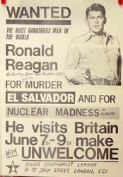 Scope and ContentPoster with an image of Ronald Reagan pointing a gun and the text: Wanted - the most dangerous man in the world - Ronald Reagan (ex-Cowboy actor now President USA) for supporting murder in El Salvador and for nuclear madness in Europe. He visits Britain June 7th-9th, make him unwlecome. Young Communist League.