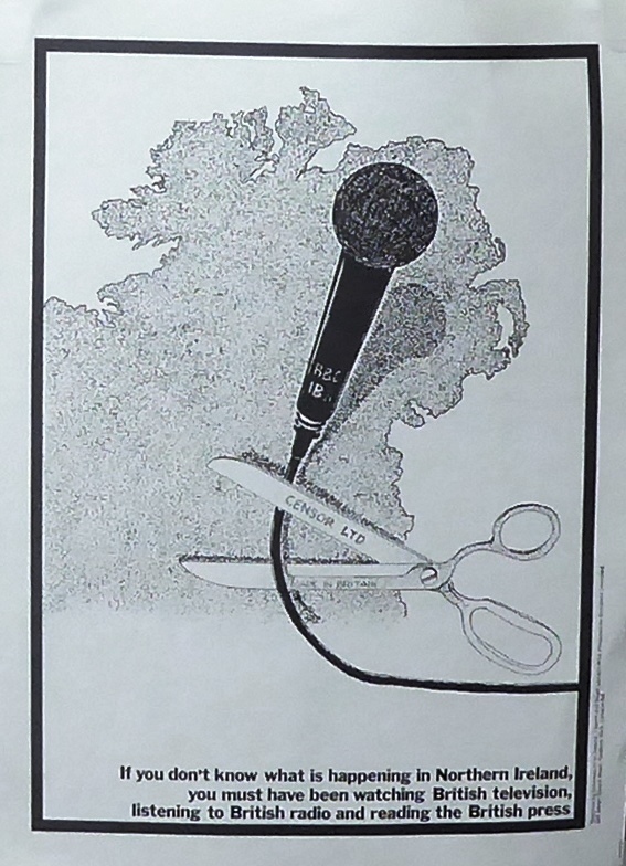 Scope and ContentPoster with an image of a microphone with the cable being cut by a pair of scissors labelled Censor and the text: If you don't know what is happening in Northern Ireland you must have been watching British television, listening to British radio and reading the British press.