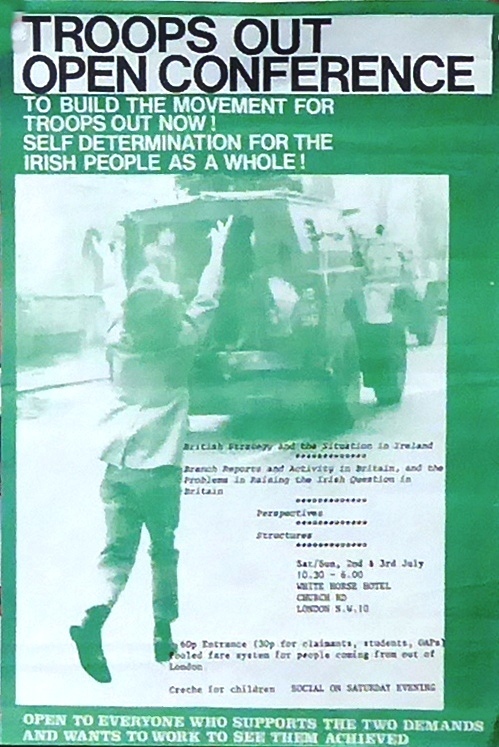 Scope and ContentPoster with an image of a boy making a V sign at an armoured vehicle and the text: Troops Out open conference. To build the movement for Troops Out Now! Self determination for the Irish people as a whole! [with details of the venue and the programme] Open to everyone who supports the two demands and wants to work to see them achieved.
