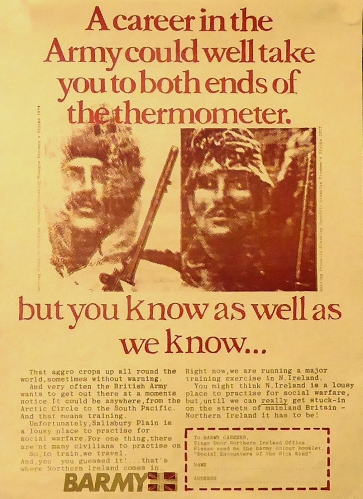 Scope and ContentPoster with images of soldiers and the text: A career in the Army could well take you to both ends of the thermometer. But you know as well as we know ... that aggro crops up all round the world, sometimes without warning. And very often the British Army wants to get out there at a moments notice. It could be anywhere, from the Arctic Circle to the South Pacific. And that means training. Unfortunately Salisbury Plain is a lousy place to practise for social warfare. For one thing, there aren't may civilians to practise on. So, to train, we travel. And yes! you guessed it! that's where Northern Ireland comes in. Right now, we are running a major training exercise in N. Ireland. You might think N. Ireland is a lousy place to practise for social warfare, but, until we can really get stuck in on the streets of mainland Britain - Northern Ireland it has to be! BARMY