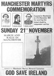 Scope and ContentPoster with images of William Allen, Michael O'Brien and Michael Larkin and a memorial and the text: Manchester Martyrs commemoration. Executed in Manchester on 23 November 1867 for asserting that Ireland should be independent and free. Sunday 21st November. March and rally in Manchester. Organised by the Manchester Martyrs Memorial Committee. God save Ireland