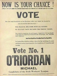 Scope and ContentPoster with the text: Now is your chance! Vote for the only candidate in the elections who says what he stands for and stands for what he says: For peaceful relations with all nations. No military pacts or bases for foreign troops. For social progress, decent wages, improved living standards and increased pensions for the old people, the widows and orphans. In South-West Dublin strike a blow for the building of a new militant labour movement in the tradition of Connolly and Larkin. Vote no 1, O'Riordan, Michael. Candidate of the Irish Workers' League.