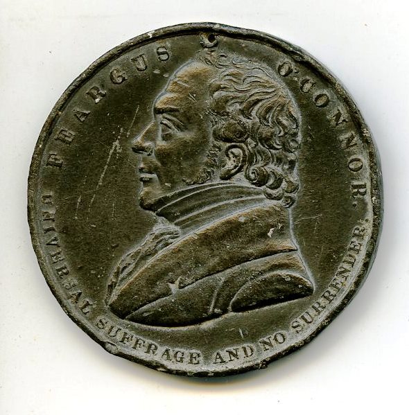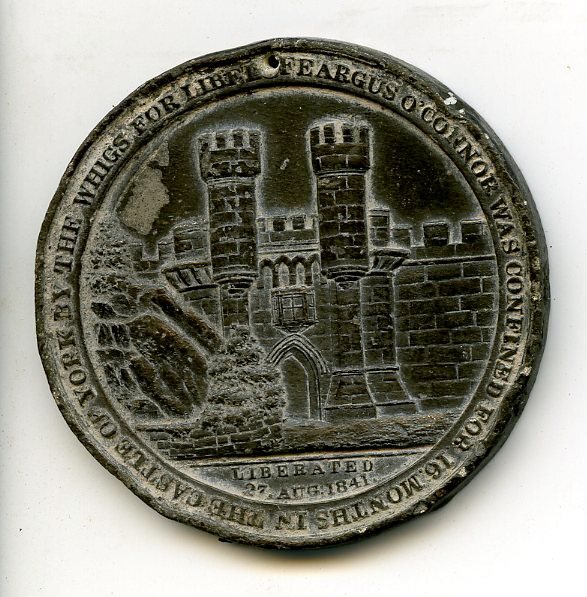 Scope and ContentMedal commemorating the release of Feargus O'Connor from York Castle on 27 Aug 1841. Front: Side portrait of O'Connor with the text 'Feargus O'Connor. Universal Suffrage and No Surrender. Reverse: Image of York Castle with the text below 'Liberated 27 Aug 1841' and surrounding text 'Feargus O'Connor was confined for 16 months in the Castle of York by the Whigs for Libel'. 2 copies [one with hole at top]