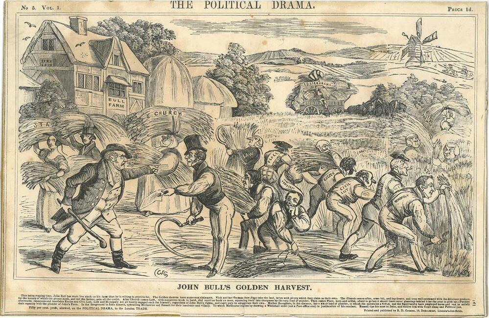 Scope and ContentEngraving by Charles Jameson Grant subtitled: This being reaping time, John Bull has more live stock on his farm than he is willing to provide for. The Golden sheaves have numerous claimants. Vick and her German Saw-Sage take the lead, laden with plenty which they claim as their own. The Church comes after, arms full, and top-heavy, and crop well-crammed with the delicious produce, for the bounty of which the prayer-book, and not the farmer, gets all the credit. After Church comes Law, with monstrous hook in hand, and aquiline hook on nose, squeezing itself into sharpness by the very load of plunder. Then comes Place, keen and selfish, afraid to go lest it should leave some gleanings behind it for the poor to pick up - Pension afterwards, rapacious and insatiable Excise and Civil List, Law and Monopoly are all busily engaged each for himself; regardless of John Bull's rights, and eager only to exaggerate their own. Mother Brougham, in the distance, has a HEAD load of plunder, to which she maintains a TITLE, and the Squirearchy have employed horse and van to satisfy their rapacitywith the plunder of John's Farm. In the foreground is John himself, upbraiding Melbourne and Russell for their insolence and villany. To which Melbourne replies by showing a Whitehall order (not a Post-office one) in justification of his conduct. Russell tips his nose at John, bullies him with Court slang and Political jaw