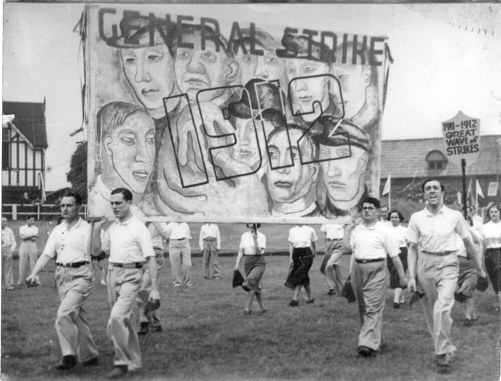 Scope and ContentBlack and white photograph of people holding banners relating to strikes taken at the Centenary pageant and sports gala held at the Manchester Athletic Club, Fallowfield, Manchester