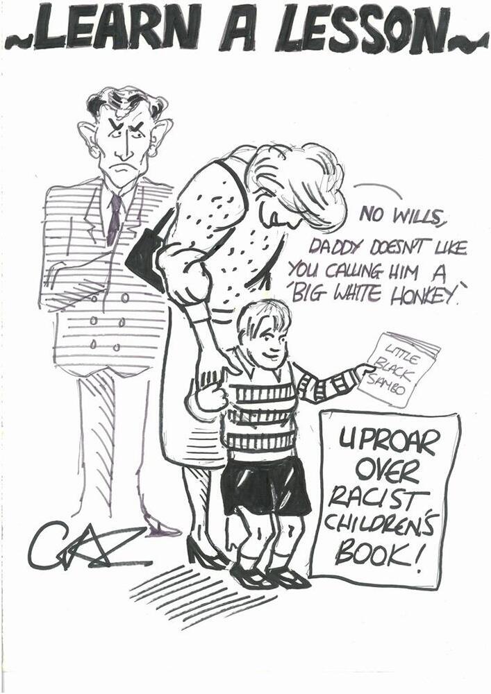 Scope and ContentCartoon with an image Prince Charles, Princess Diana and Prince William. A billboard reads Uproar over racist children's book! Prince William has a copy of Little Black Sambo in his hand and Princess Diana is saying to him No Wills, Daddy doesn't like you calling him a 'big white honkey'