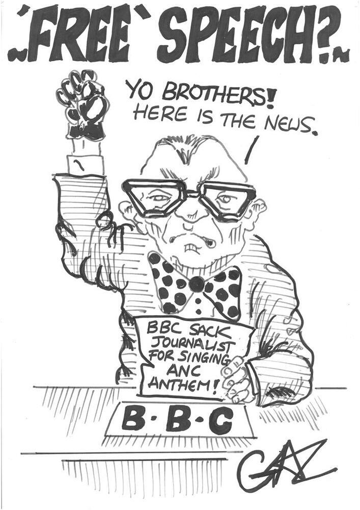 Scope and ContentCartoon headed 'Free' speech?, with an image of Robin Day with raised gloved fist. He is holding a paper reading BBC sack journalist for singing ANC anthem! and saying: Yo brothers! Here is the news