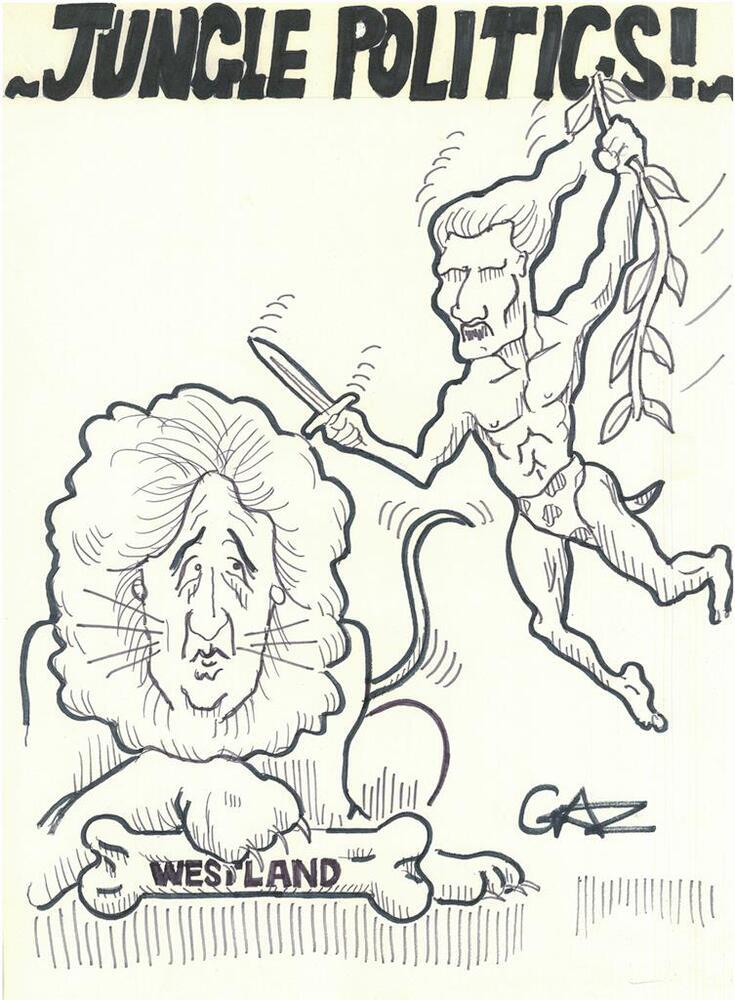 Scope and ContentCartoon headed Jungle politics!, with an image of Michael Heseltine as Tarzan holding a sword and swinging down on Margaret Thatcher as a lion who is holding a bone labelled Westland
