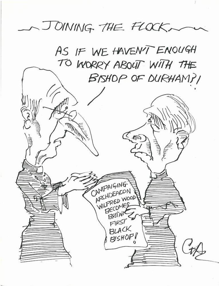 Scope and ContentCartoon headed Joining the flock, with an image of two priests. One is holding a newspaper with the headling Campaigning Archdeacon Wilfred Wood becomes Britain's first black bishop! and the other is saying to him: As if we haven't enough to worry about with the Bishop of Durham?!