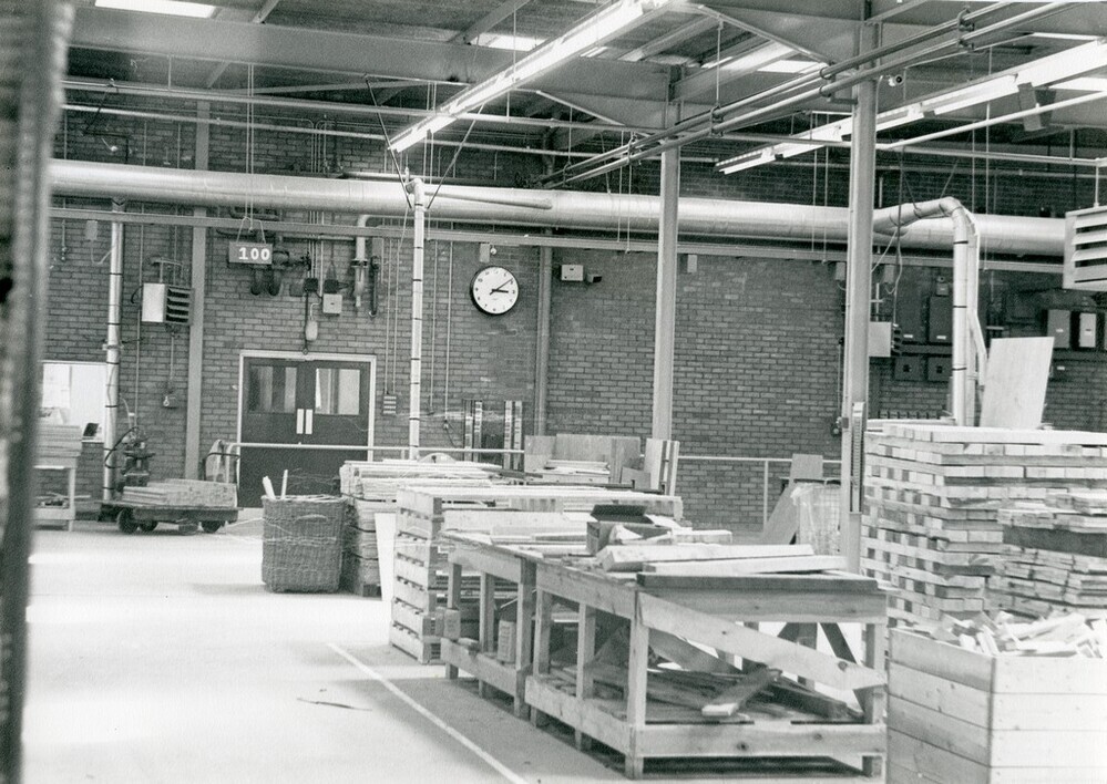 Scope and ContentBlack and white photograph of the factory floor showing stacked timber and equipment