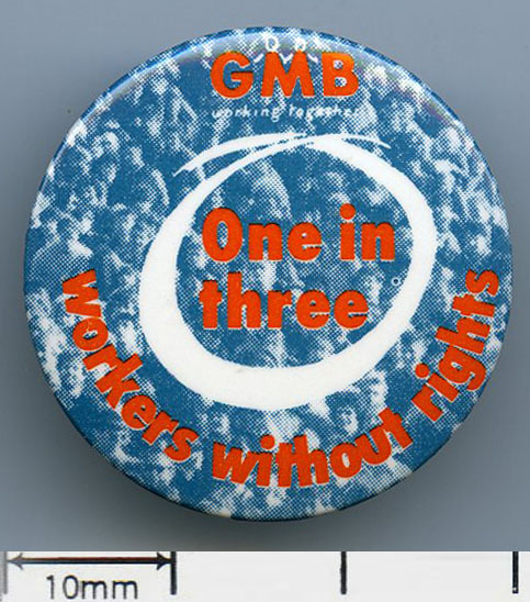 Scope and ContentTin badge with the text: GMB Working together. One in three workers without rights,