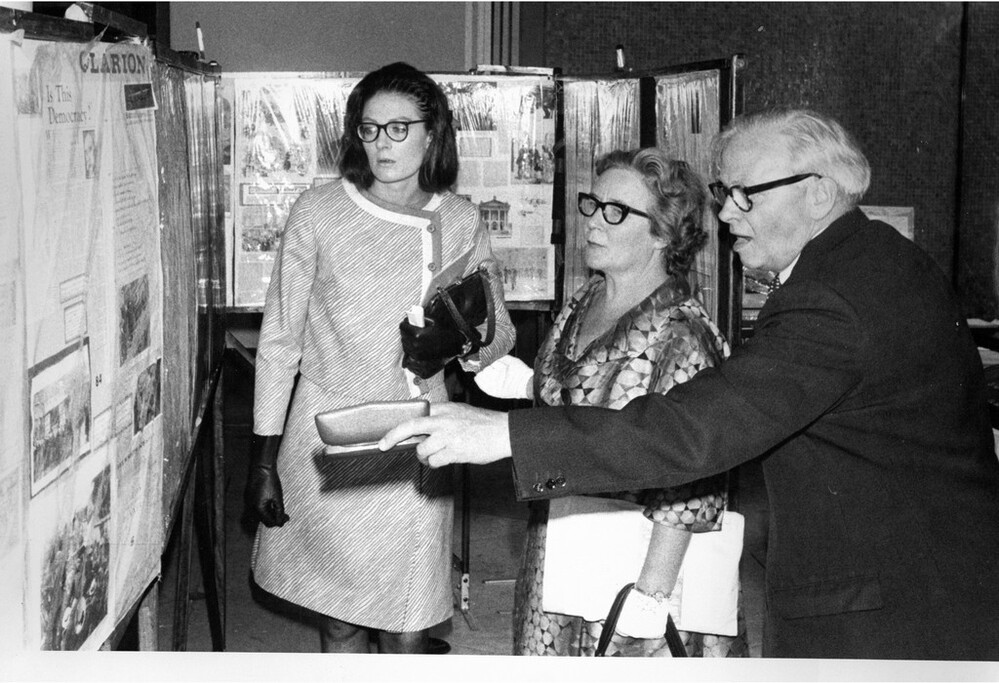 Scope and ContentBlack and white photograph of Vanessa Redgrave and Henry Fry looking at an exhibition at the Trades Union Congress