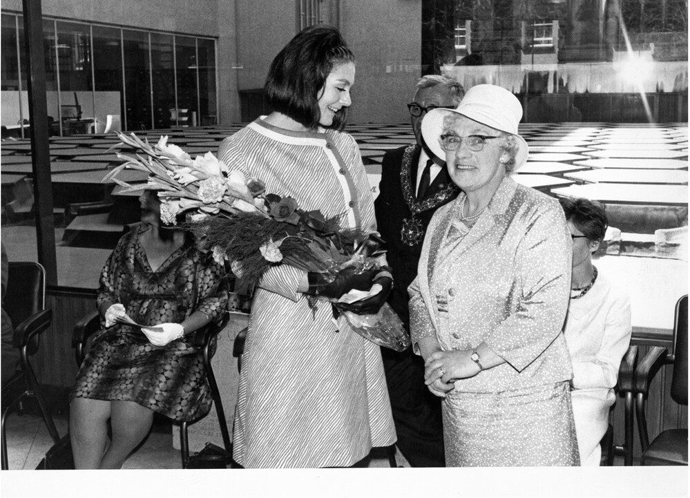 Scope and ContentBlack and white photograph of Vanessa Redgrave holding a bunch of flowers and an unidentified women at the Trades Union Congress