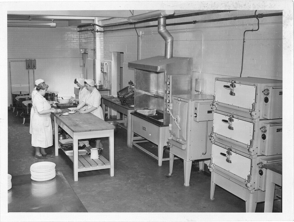 Scope and ContentBlack and white photograph of a team of 4 caterers working in a canteen kitchen