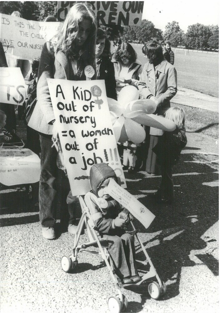 Scope and ContentBlack and white photograph of a demonstration in support of nursery education. A woman with a child in a pushchair holds a banner reading: A kid out of nursery = a woman out of a job