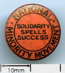 Scope and ContentTin badge with the text: National Minority Movement. Solidarity spells success