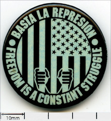 Scope and ContentTin badge with an image of the American flag turned vertically so that the stripes appear as prison bars. Two hands grip the bars near the bottom of the image. With the text: Freedom is a constant struggle. Basta la represion