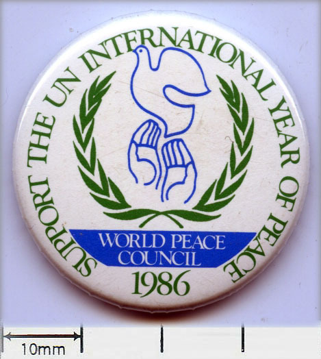 Scope and ContentTin badge with an image of a laurel wreath and a dove and the text: World Peace Council 1986. Support The UN International Year of Peace