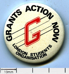 Scope and ContentTin badge with the text; Grants action now. London Students Organisation.