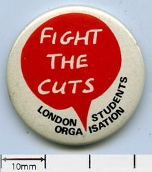 Scope and ContentTin badge with the text: Fight the cuts. London Students Organisation.