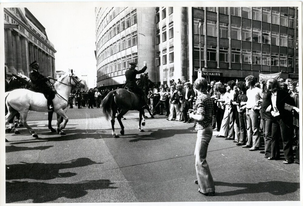 Scope and ContentBlack and white photograph of a demonstration with a line of protesters being stopped by police officers on horseback. Caption on the back reads: Liberation v Nat. Front demo, Red Lion Sq. 15 June 74