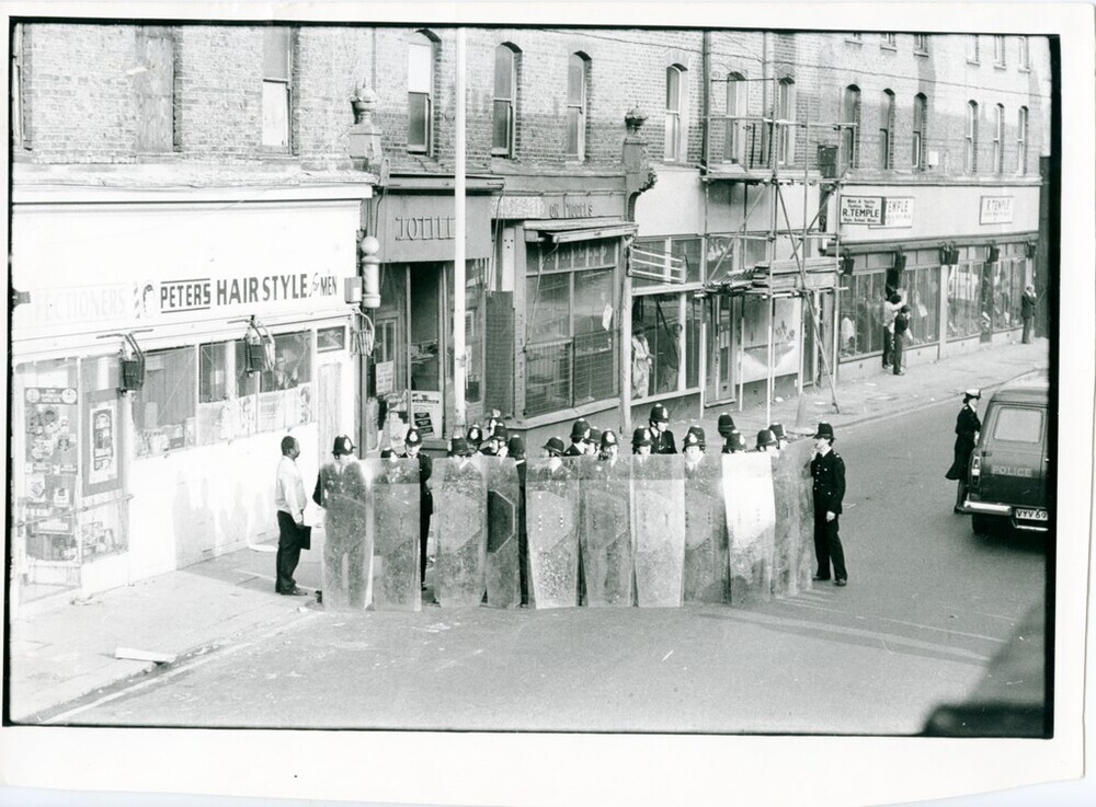 Scope and ContentBlack and white photograph of a group of police officers with riot shields standing in a street [possibly Atlantic Road]
