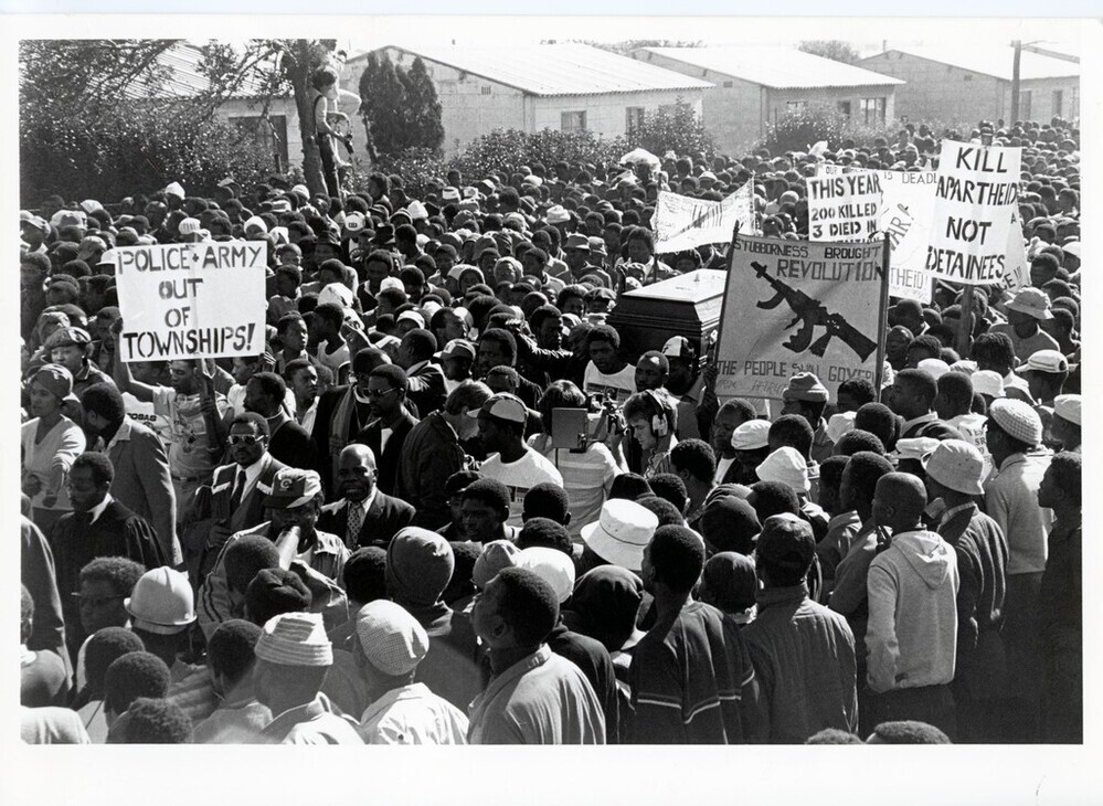 Scope and ContentBlack and white photograph of the large crowd at the funeral of Andries Raditsela, activist and trade unionist, in Tsakane Township, Eastern Rand, South Africa. Some are holding banners