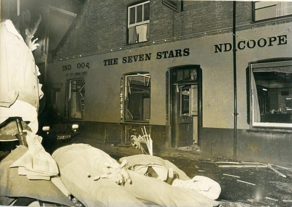 Scope and ContentBlack and white photograph of the exterior of the Seven Stars Pub, Guildford after an IRA bomb was detonated
