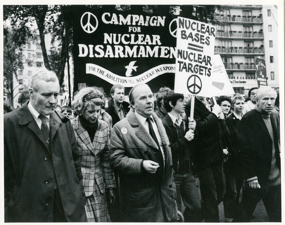 Scope and ContentBlack and white photograph of a Campaign for Nuclear Disarmament Protest and Survive demonstration, London; Tony and Caroline Benn at front left. Stan Orme in the centre. There is a Campaign for Nuclear Disarmament banner in the background and a person carrying a placard reading: Nuclear bases = nuclear targets