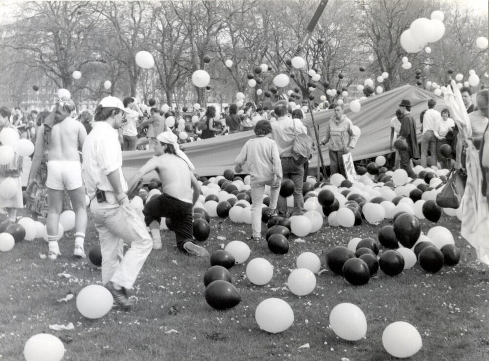 Scope and ContentBlack and white photograph of protesters at a Campaign for Nuclear Disarmament/Friends of the Earth rally in Hyde Park, London. There are numerous demonstrators surrounded by balloons