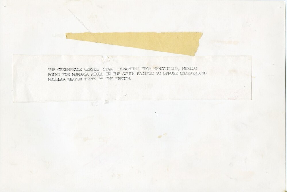 Scope and ContentBlack and white photograph of the Greenpeace vessel SV Vega (also called SV Greenpeace III) bound for Moruroa Atoll to oppose French underground nuclear weapon tests.