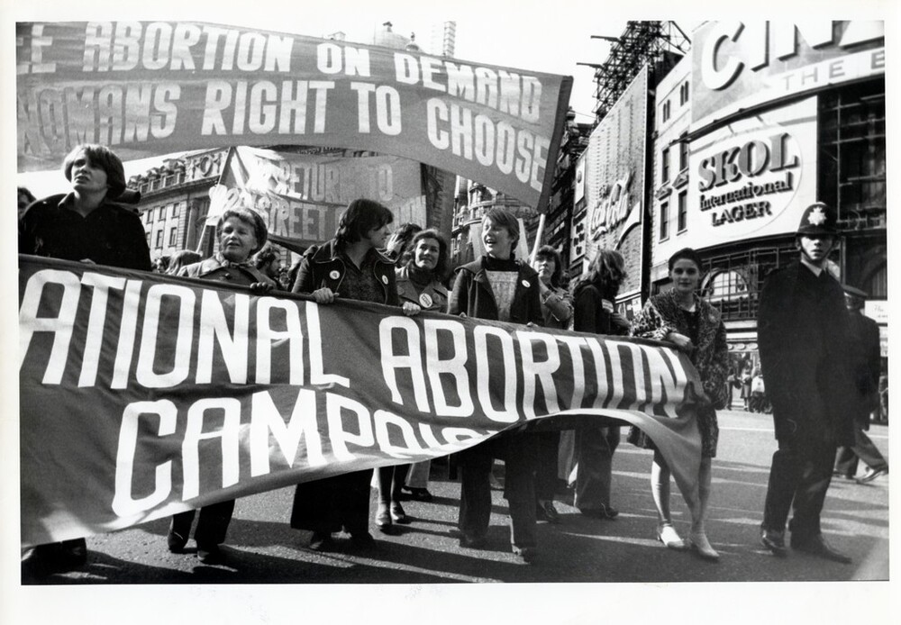 Scope and ContentBlack and white photograph of marchers at a National Abortion Campaign demonstration. They are mainly women and they are holding three large banners. Caption on the back reads: Over 10,000 marched from Speakers Corner to Trafalgar Square