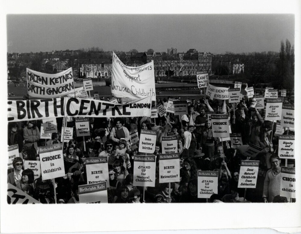 Scope and ContentBlack and white photograph of a large group of protesters holding placards and banners. 5000 people marched to Hampstead Heath in London in support of women's right to active birth