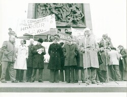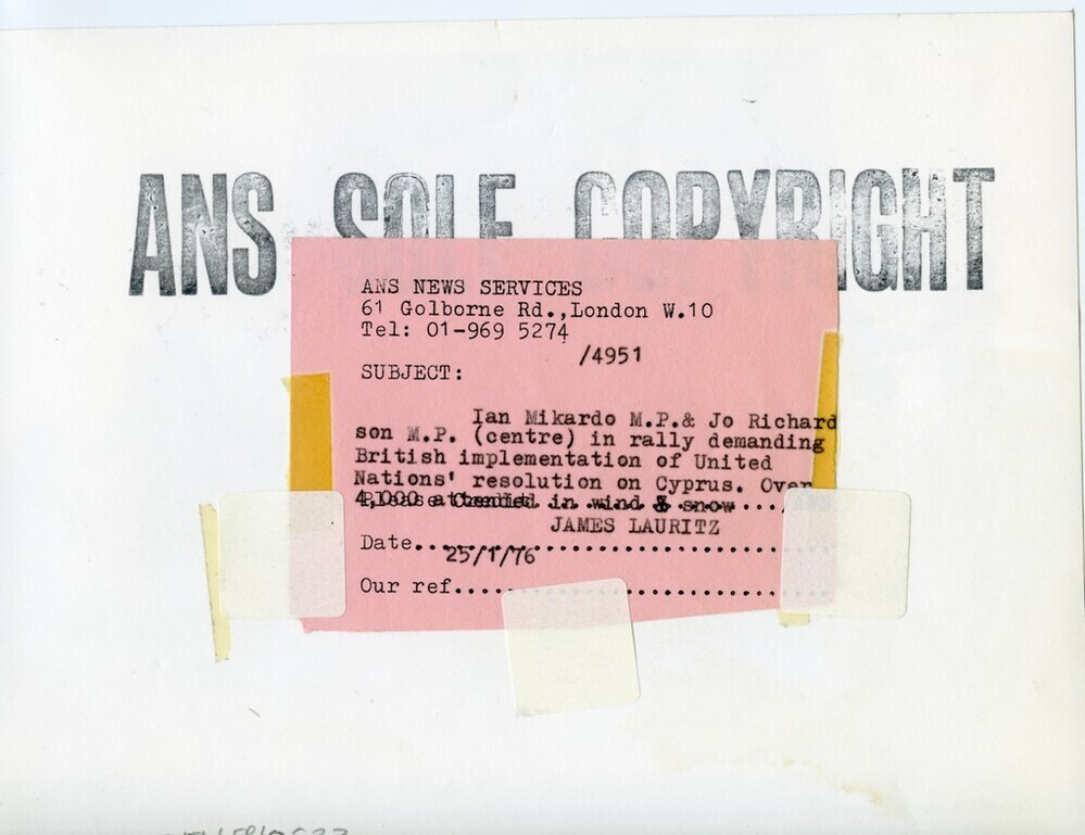 Scope and ContentBlack and white photograph of a group of people with banners on the plinth of Nelson's Column in Trafalgar Square. Caption on the back reads: Ian Mikardo MP and Jo Richardson MP (centre) in rally demanding British implementation of the United Nations resolution on Cyprus. Over 4000 attended in rain and snow.'