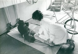 Scope and ContentBlack and white photograph of a person with one leg exercising. Caption on the back reads: In Rehabilitation section, physical therapy and physio-therapy departments help people to face life again after loss of limbs or other illness