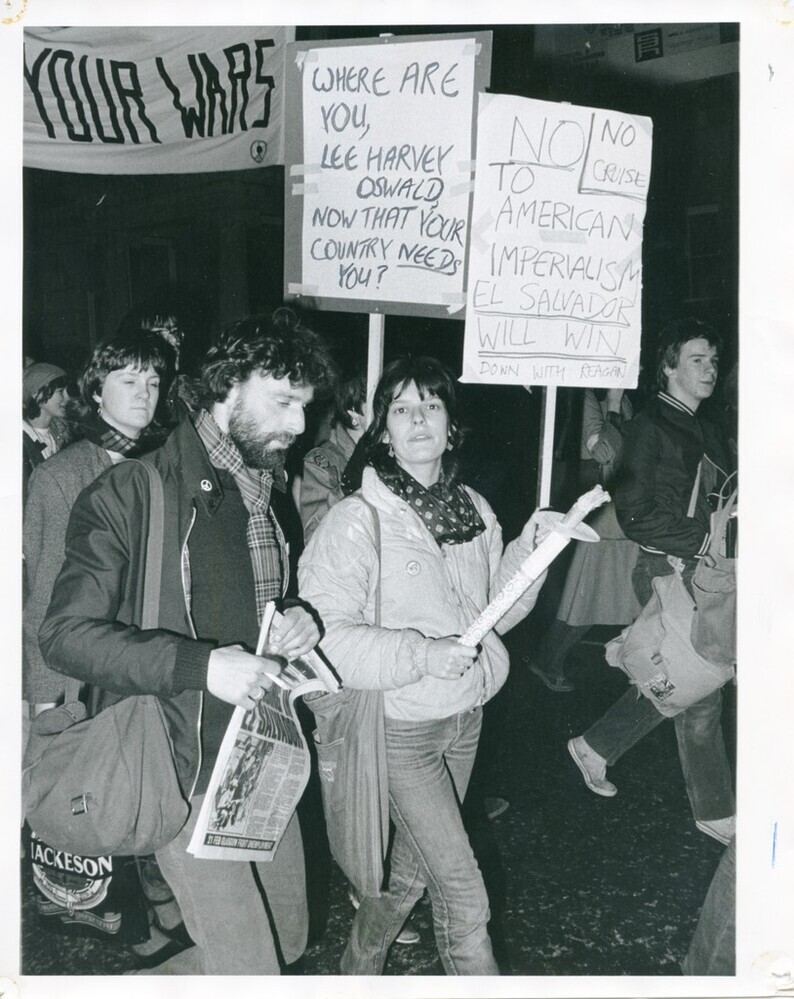 Scope and ContentBlack and white photograph of protesters against American involvement in El Salvador outside the American Embassy, Grosvenor Square, London