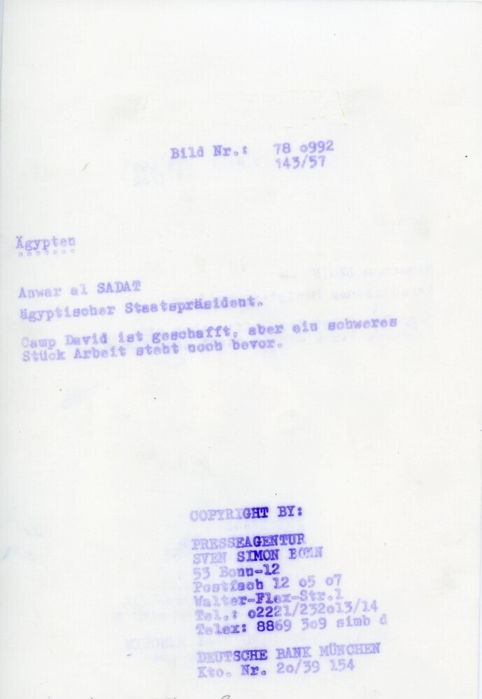 Scope and ContentBlack and white photograph of Anwar Sadat. Caption on the back reads: Anwar al Sadat, President of Egypt at the Camp David talks where a heavy piece of work lies before them (translated from German)