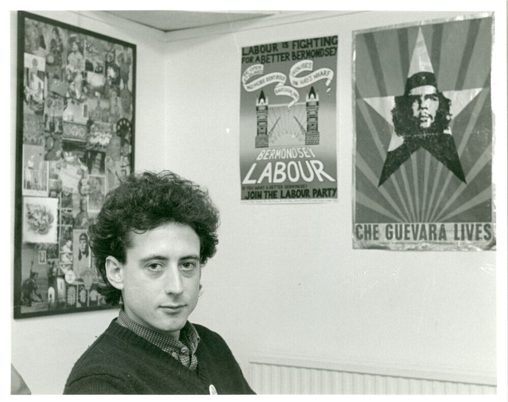 Scope and ContentBlack and white photograph of Peter Tatchell, human rights campaigner, with Bermondsey Labour Party and Che Guevara posters behind him
