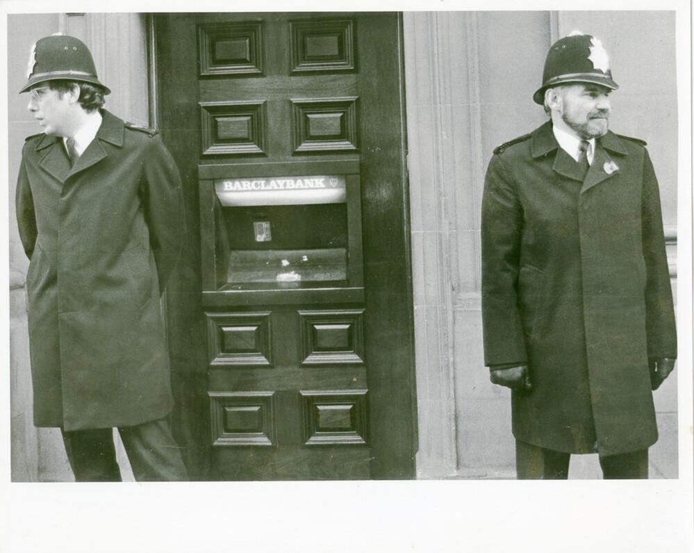 Scope and ContentBlack and white photograph of two police officers standing by a Barclaybank cash machine